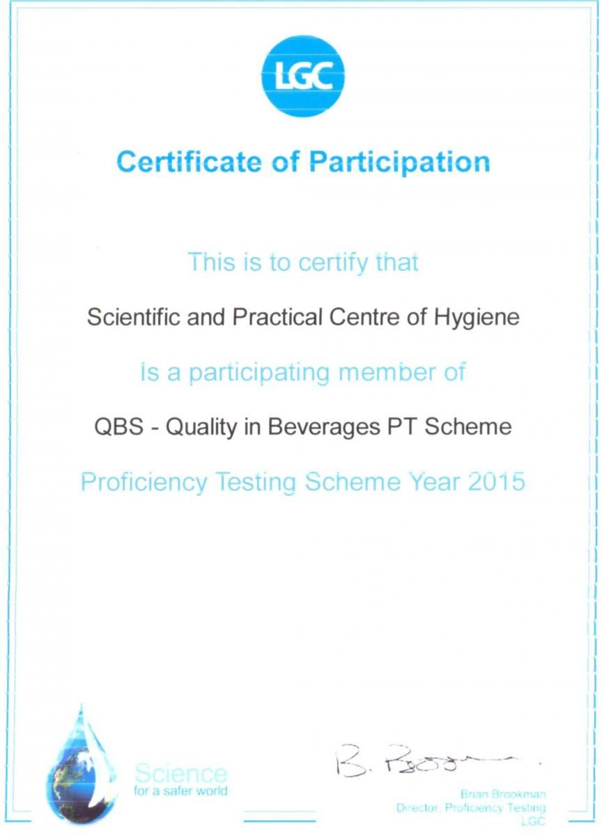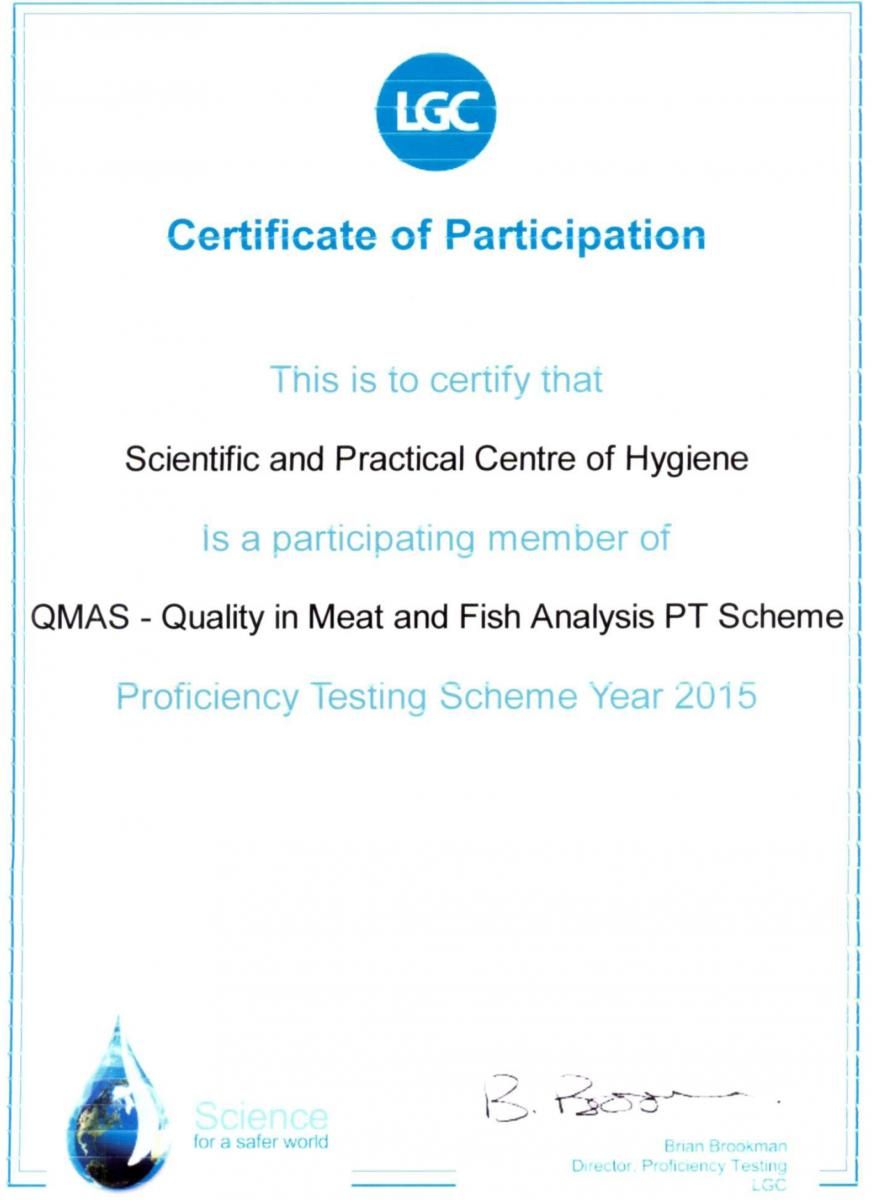Высокий уровень компетентности подтвержден положительными результатами участия в марте 2015 года в международных межлабораторных сравнительных испытаниях проводимых «LGC Standards» (Великобритания) в программах по анализу напитков (QBS) и рыбной продукции (QMAS).