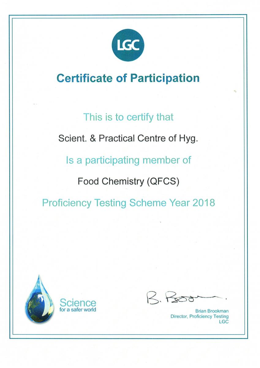 Высокий уровень компетентности подтвержден положительными результатами участия в международных межлабораторных сравнительных испытаниях, проводимых «LGC Standards» (Великобритания) в программах по определению пищевых красителей в пищевой продукции (QFCS) (май 2018 года) и определению антибиотиков (хлорамфеникол) в пищевой продукции (QMAS) (июль 2018 года).